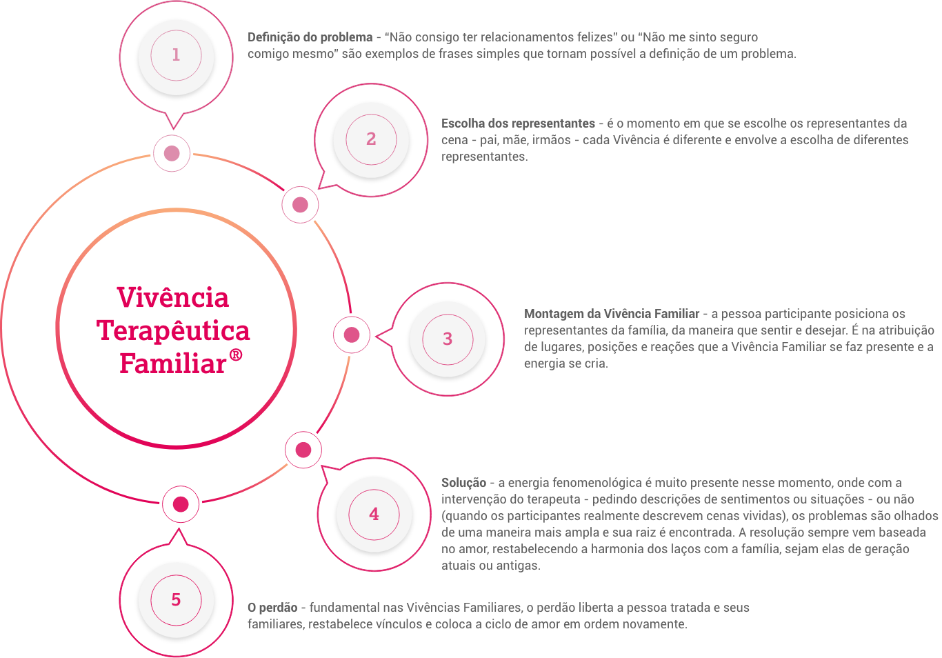 Durante as Vivências, além de entender onde está sua dor e trabalhá-la, acontece o mais importante: a resolução do problema. Essa resolução acontece através do perdão, aceitação, do “deixar ir”, honrar sua geração e do amar. Para isso, segue-se alguns passos: