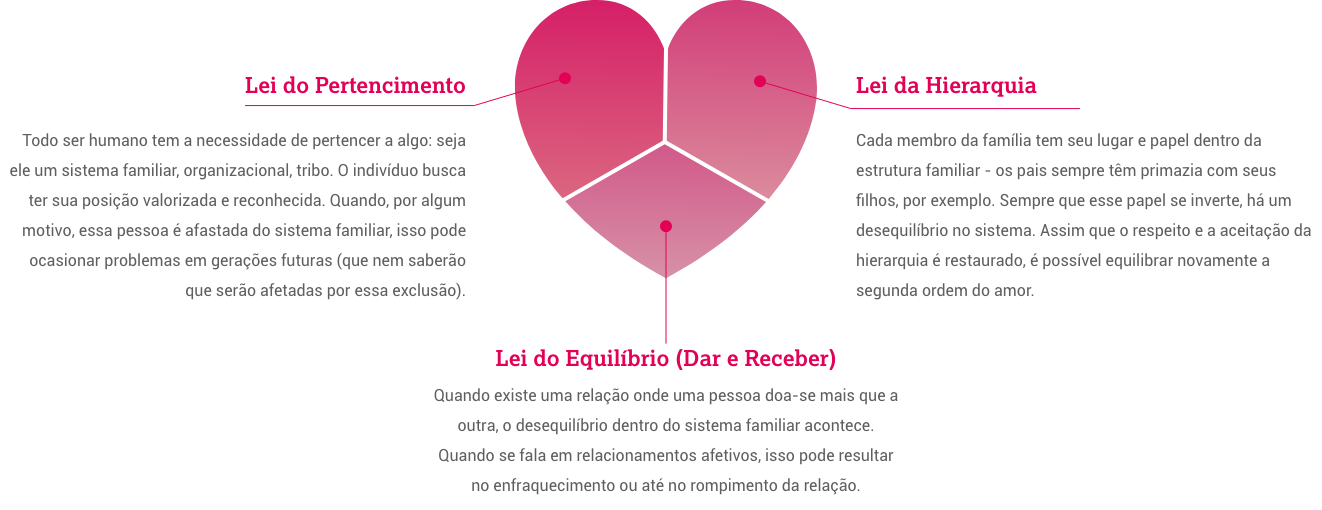 Segundo Bert Hellinger, há três leis que devem ser obedecidas para que todo tipo de relacionamento dê certo: Pertencimento, Hierarquia (Precedência) e Equilíbrio entre Dar e Receber.
